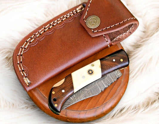 Damascus Knife Store Handmade Steel Pocket Knife – Rosewood & Bone