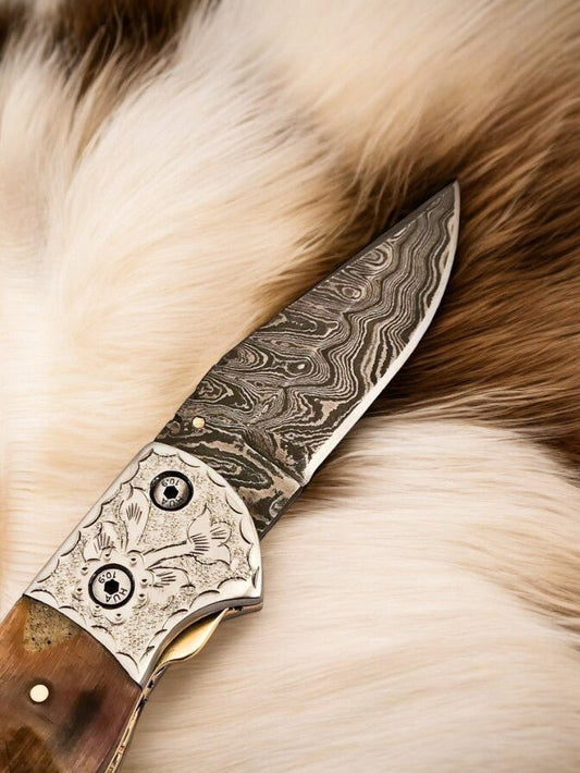 Damascus Knife Store Handmade Folding Knife – Sheep Horn Handle