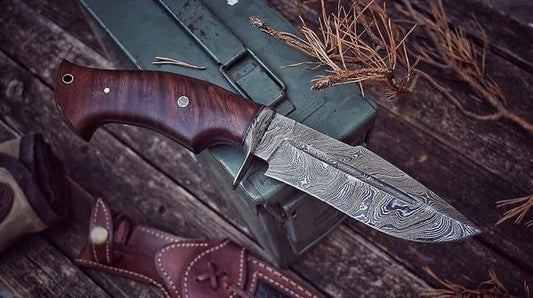Texan Knives Good Hunting Knives – 10" Damascus Steel Blade with Rosewood Handle & Leather Sheath