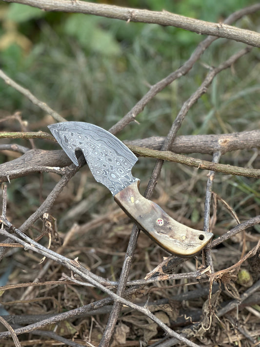 Texan Knives Custom Handmade Damascus Steel Guthook Skinning Knife with Sheep Horn Handle - 7.5” with Leather Sheath