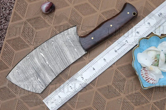 White Hills Knives 10" Damascus Chef Meat Cleaver with Dark Wood Handle & Leather Sheath, Damascus Steel Cleaver Chopper