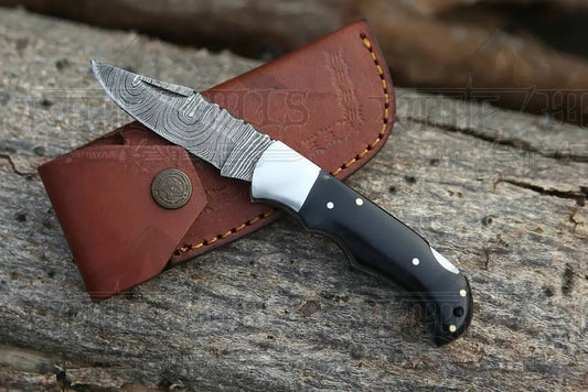White Hills Knives Custom Hand Forged Damascus Folding Knife Brass Bolster With Horn & Stain Wood Handle WH 5002