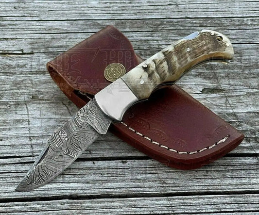 White Hills Knives Handmade Forged Damascus Steel Hunting Folding Camping Pocket Knife With Stag Antler Camel Bone & Steel Bolster Handle WH 3986