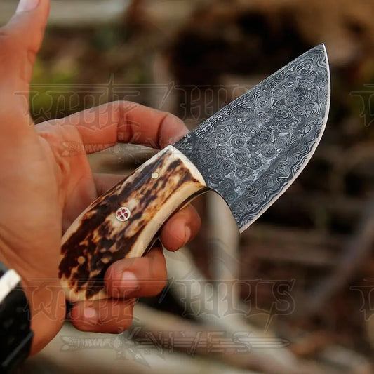 White Hills Knives 7” Handmade Damascus Steel Skinner Knife - Stag Antler Handle - Full Tang