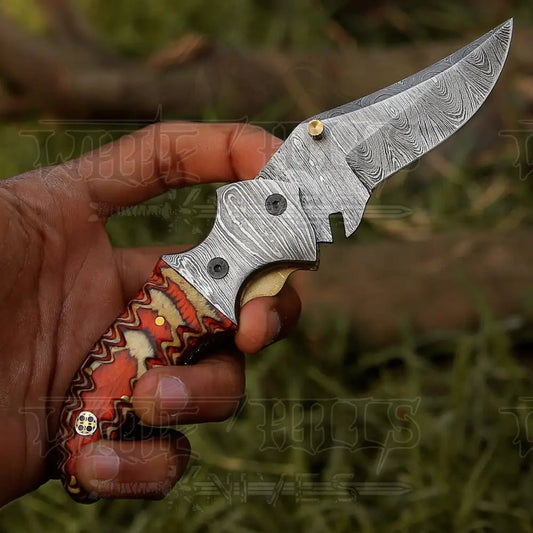 White Hills Knives Handmade Damascus Steel Hunting Folding Knife with Pocket Clip - Camping Folding Blade With Red Wood Handle WH 1255-CP
