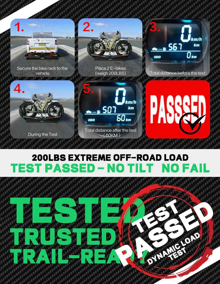 Engineered for both rugged trails and city streets with 200lbs capacity (industry-leading for e-bikes). Our reinforced steel-aluminum construction handles intense off-road conditions while maintaining sleek urban aesthetics. Tested stable at 70mph highway speeds, this e-bike rack delivers confidence on every journey.
