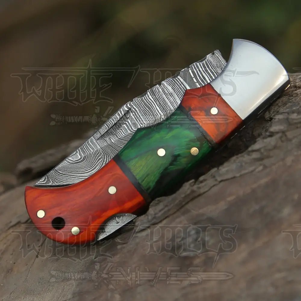 Customs Hand Made Damascus Steel Hunting Folding Knife Steel Bolster with colored Wood Handle