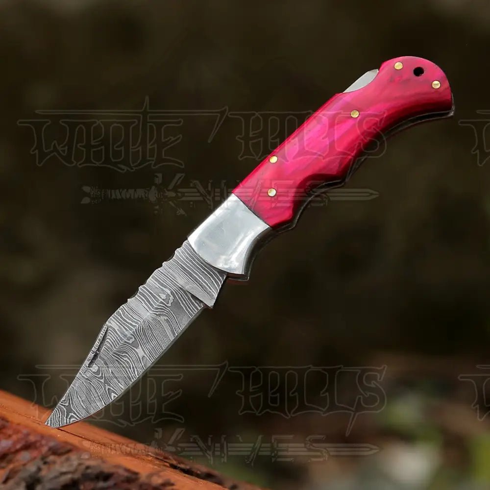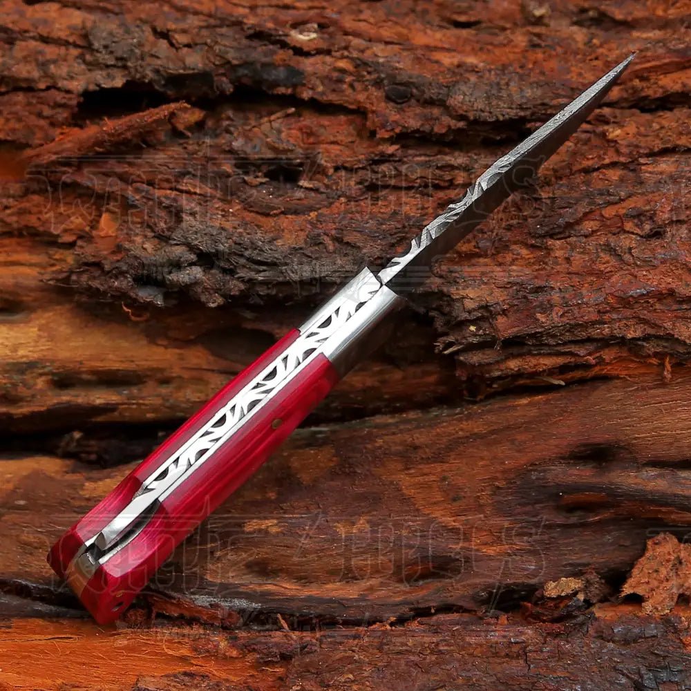Customs Hand Made Damascus Steel Hunting Folding Knife Steel Bolster with colored Wood Handle