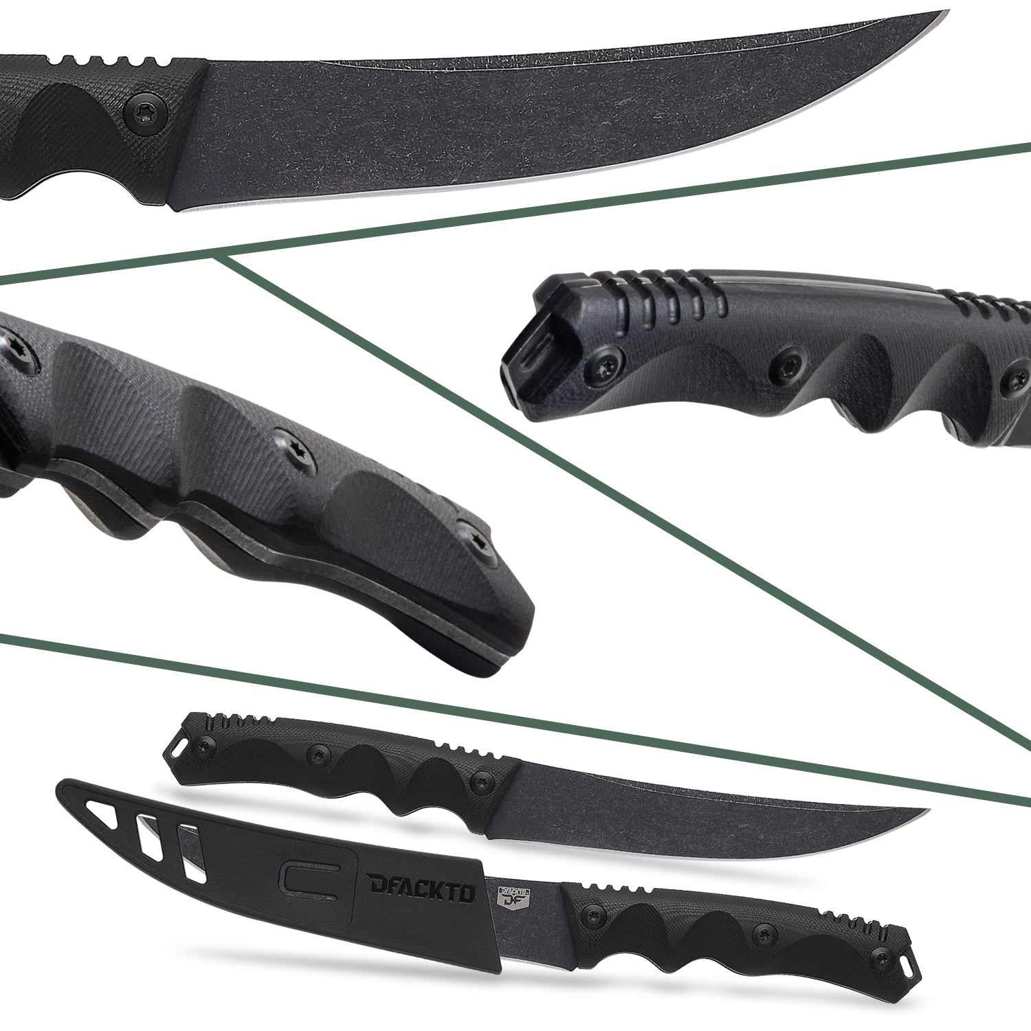 The DFACKTO Interceptor 6" Hybrid Boning and Fillet Knife is crafted from high-carbon stainless steel with a full tang for exceptional strength. Designed for both indoor and outdoor use, it excels in cold, wet, and slippery environments. This tactical culinary knife delivers precise control and durability, making it an essential tool for any field-to-table task where reliability and accuracy are critical.