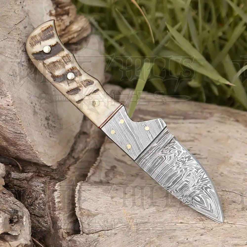 Each White Hills Knives 7.25” Handmade Forged Damascus Steel Full Tang Skinner Knife is crafted by hand to ensure durability and uniqueness. It features a stunning Damascus Bolster with intricate filework details and is designed for everyday use and carry. The horizontal or vertical wearing options can be seen in the accompanying pictures. The blade is made with a combination of 15N20 and 1095 high carbon metals, creating a striking contrast in design. Our Damascus steel is 100% genuine and uniquely handmade to order, making each knife truly one of a kind. Replicating the intricate patterns and handle design is impossible, ensuring the individuality of your Damascus blade.
