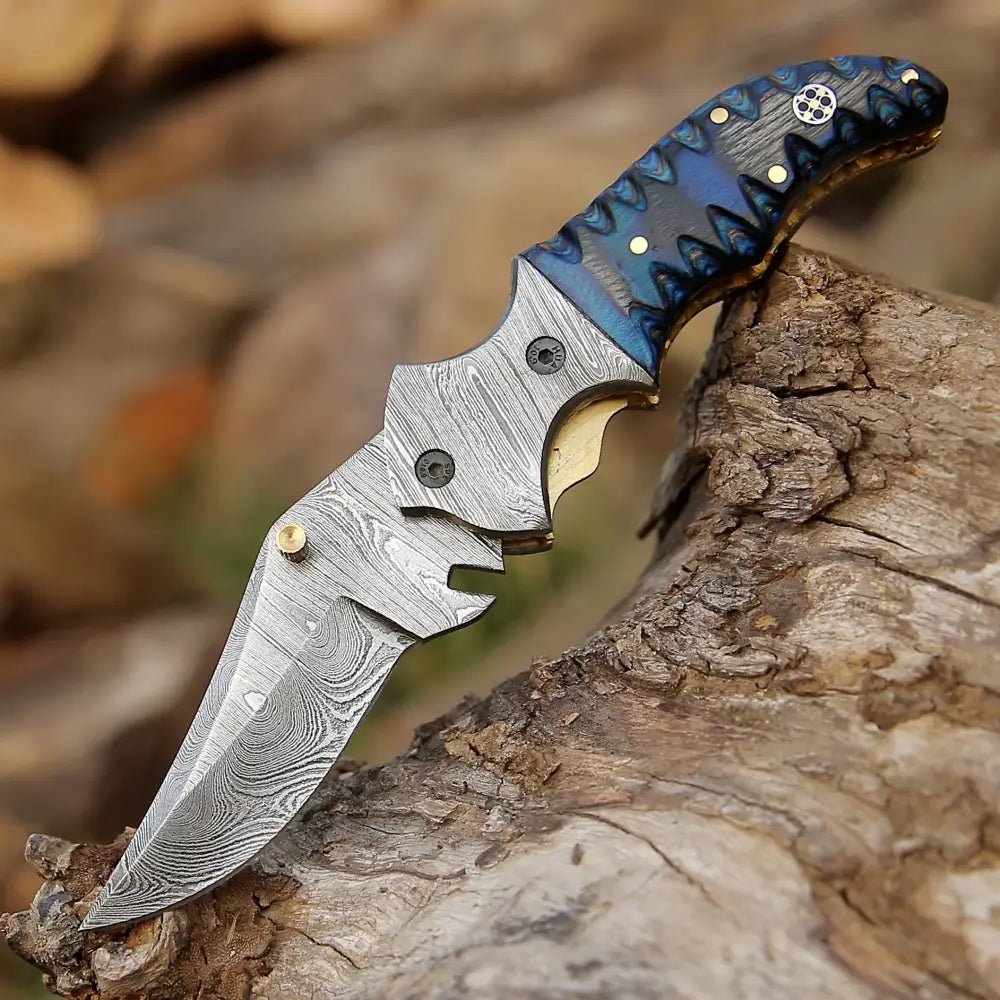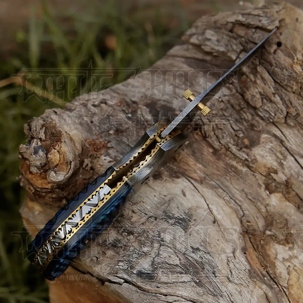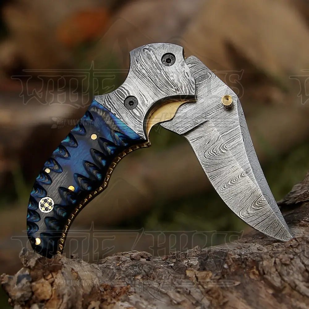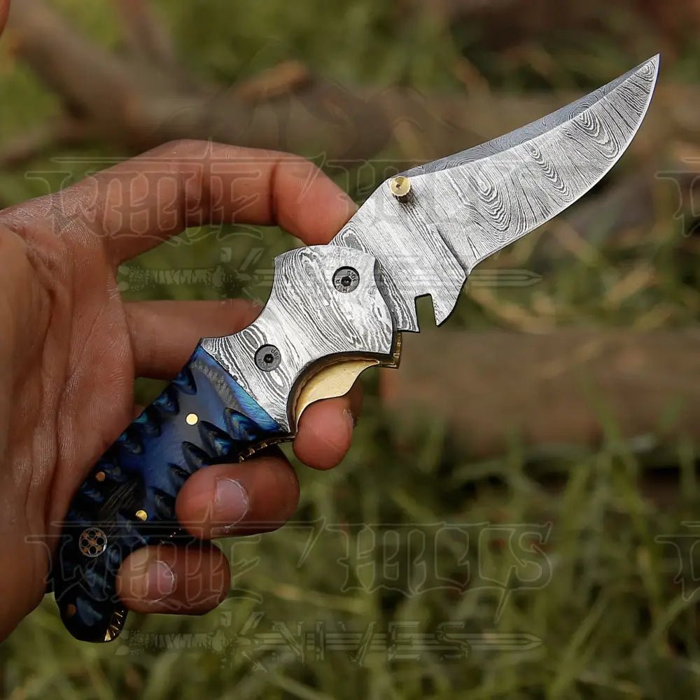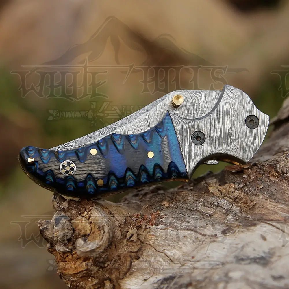 Customs Hand Made Damascus Steel Hunting Folding Knife Damascus Steel Bolster with Blue Pakka Wood Handle