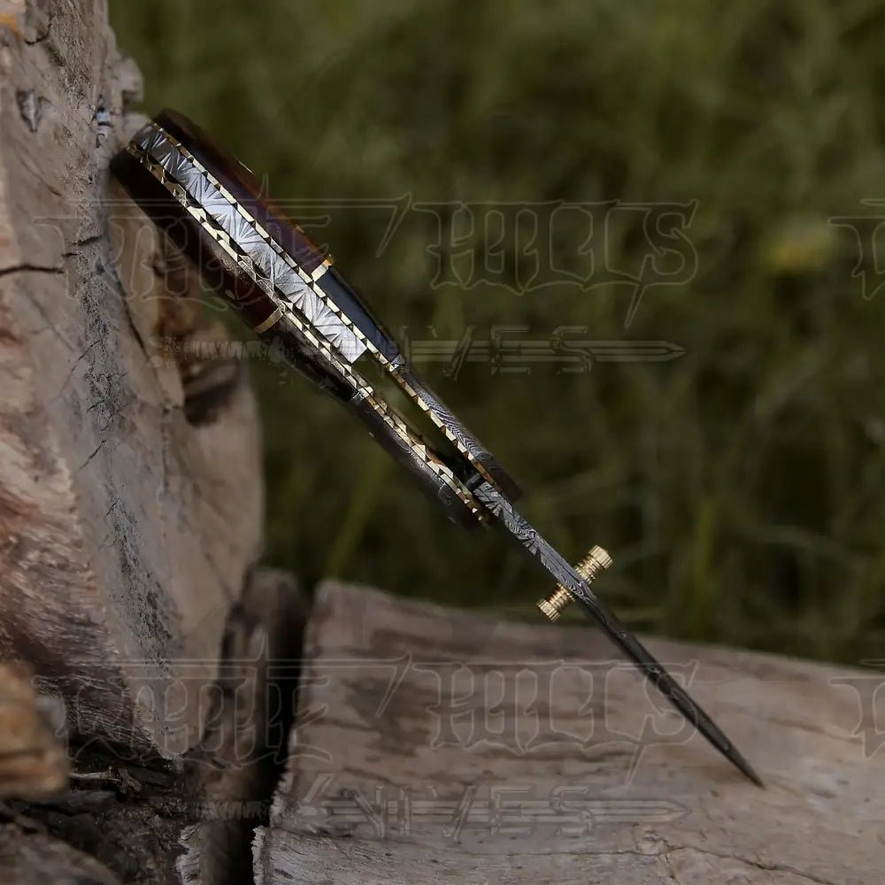 Customs Hand Made Damascus Steel Hunting Folding Knife Damascus Steel Bolster with Dark Wood & Bull Horn Handle