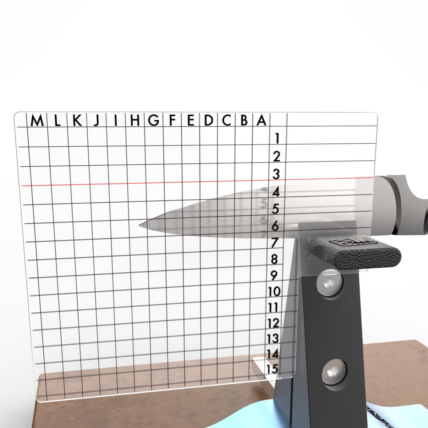 The Advanced Alignment Guide provides measurable reference points for repeatable knife mounting. The grid allows a Wicked Edge user to be able to tilt a knife in the clamp to find the optimum knife positioning and record the setting so the mounting position can be repeated during the next sharpening session.