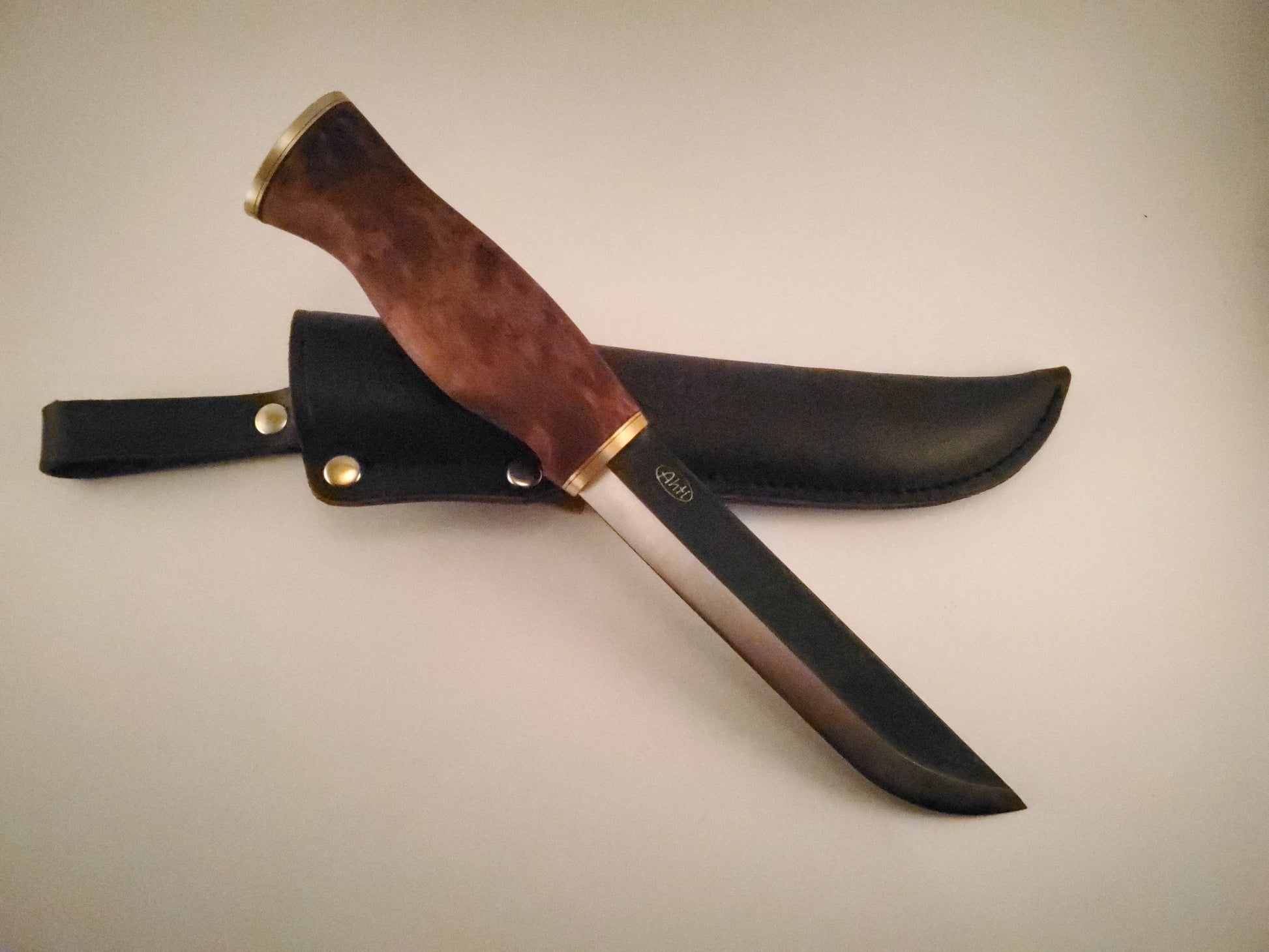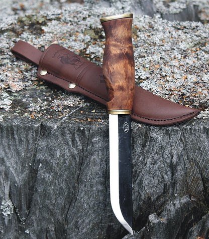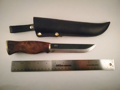 The Leuku 145 would make a good butchering tool or light camp knife. This knife has a fine whittling edge. The handle has brass plates at both ends, and the squared end of the pommel is visible at the pommel plate. The sheath has a belt loop. If you are going to use it for light chopping you should add a bit secondary or convex to the grind.