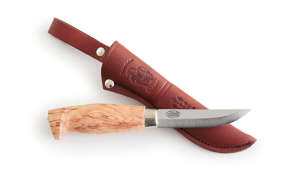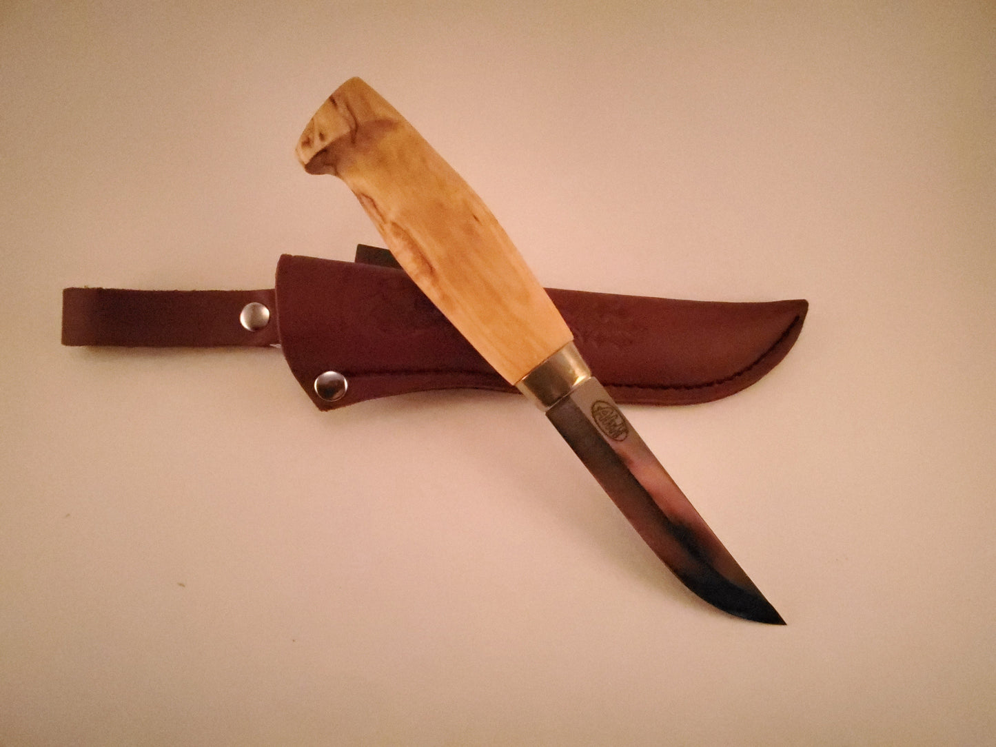 This version of the Metsa has a stainless blade. The handle is oiled to bring out the grain of the wood, but not stained. The handle would work best for average or slightly larger hands. This is a knife for outdoor work in all seasons. The sheath has a sturdy belt loop which will take belts up to about 2".