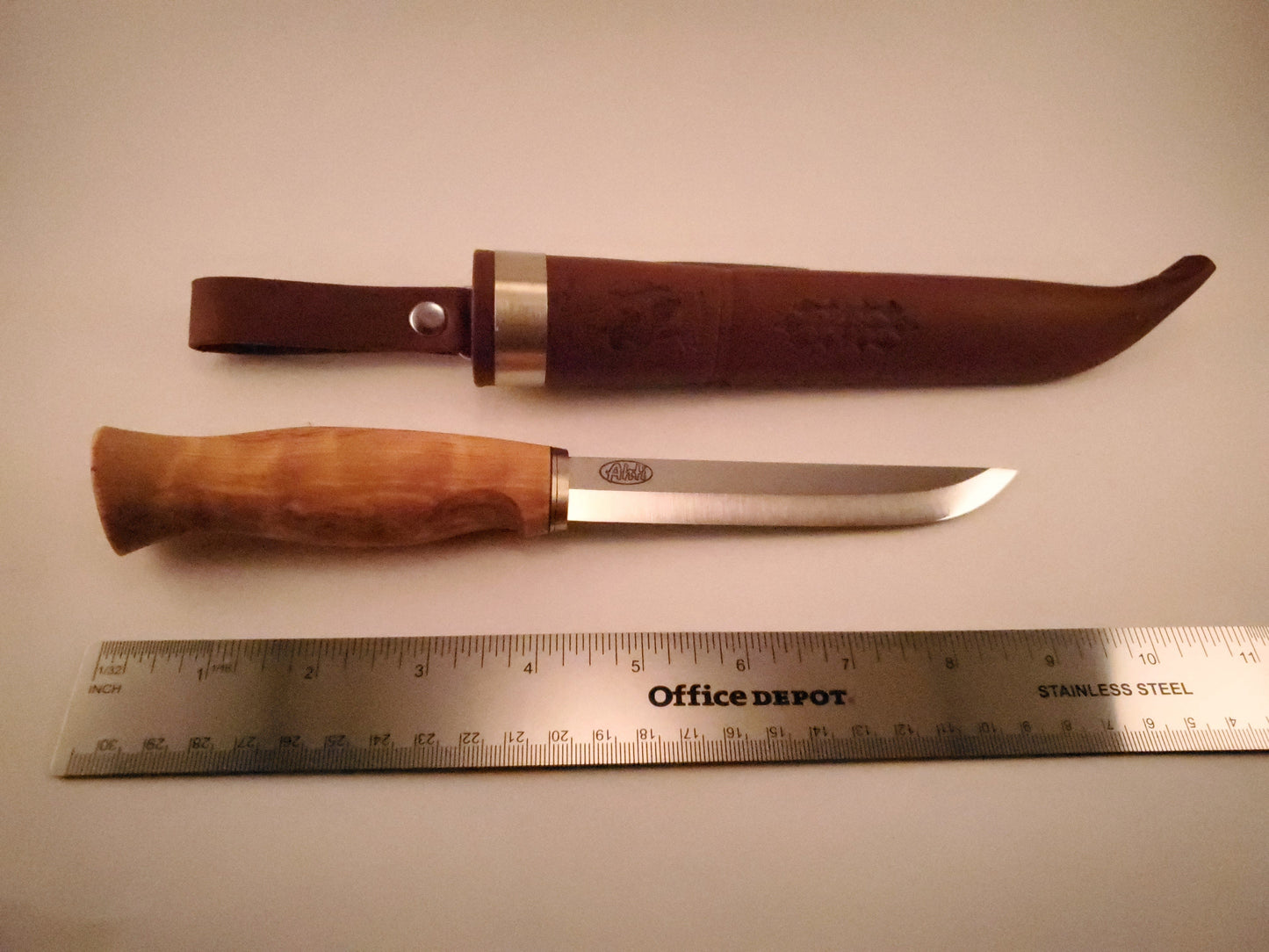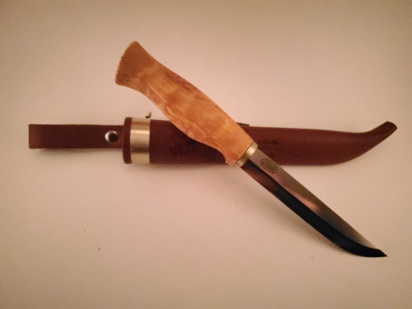 The Vaara ("Northern Hills") is a bit larger in size and makes an excellent all around utility knife. The handle has a suggestion of a hook and the pommel end, and a slight cutout for the forefinger to add control. The handle is nicely sized for average sized hands.