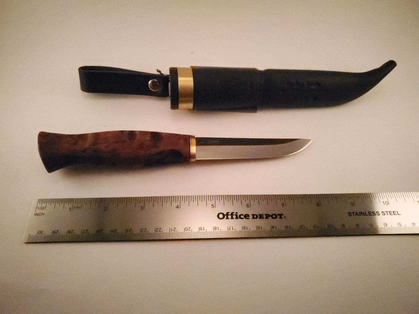 The Ahti Vaara ("Northern Hills") is a bit larger in size and makes an excellent all around utility knife. The handle has a suggestion of a hook and the pommel end, and a slight cutout for the forefinger to add control. The handle is nicely sized for average sized hands.