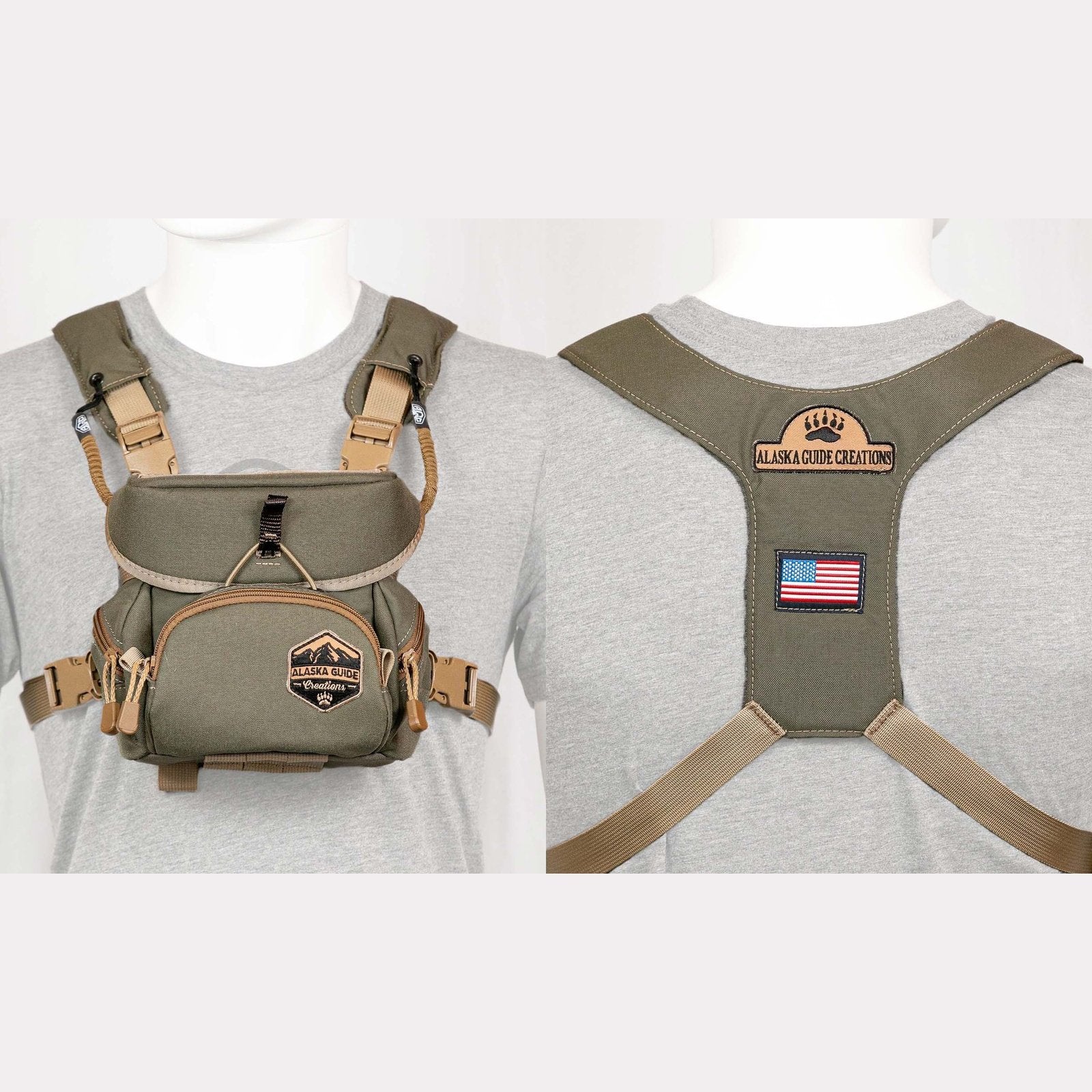 Nothing beats the "Original." The Alaska Classic offers the classic design features of the original binocular harness chest pack Jaret developed 40+ years ago with today’s modern advancements in innovation and durability. These are our mid-size line and are meant to accommodate full size binoculars up to around 50mm objective lenses. For example, most 10×50 and 12×50 binoculars would fit perfect in the regular harnesses. Main Compartment measurements are approximately 6.75 inch tall x 6.5 inch wide x 3.5 inch deep. Front Compartment measurements are approximately 4.5 inch tall x 6 inch wide x 1.5 inch deep. Side Compartment measurements are approximately 2.5 inch wide x 1 inch deep. Rear Compartment measurements are 5 inch tall x 6.5 inch wide "flat"