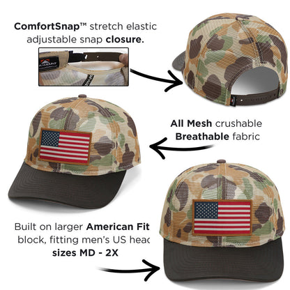 Part of our Patriot Series the Breeze all mesh American Flag Caps are a full line of crushable and extremely breathable all mesh caps. This vintage WW2 All Mesh camo crown features a waxed cloth slightly curved visor and full color American Flag patch. Coupled with our American Fit™ design, fitting US heads sizes MD - 2X. Traditional caps only fit sizes SM - XL. American Fit™ sizing is a throw back to the original American size standard established in 1929. Lastly, the ComfotSnap Snapback closure offers the comfort of a stretch fit with the adjustability of a snapback.- RIVERSIDE 6-PANEL with slightly curved visor