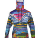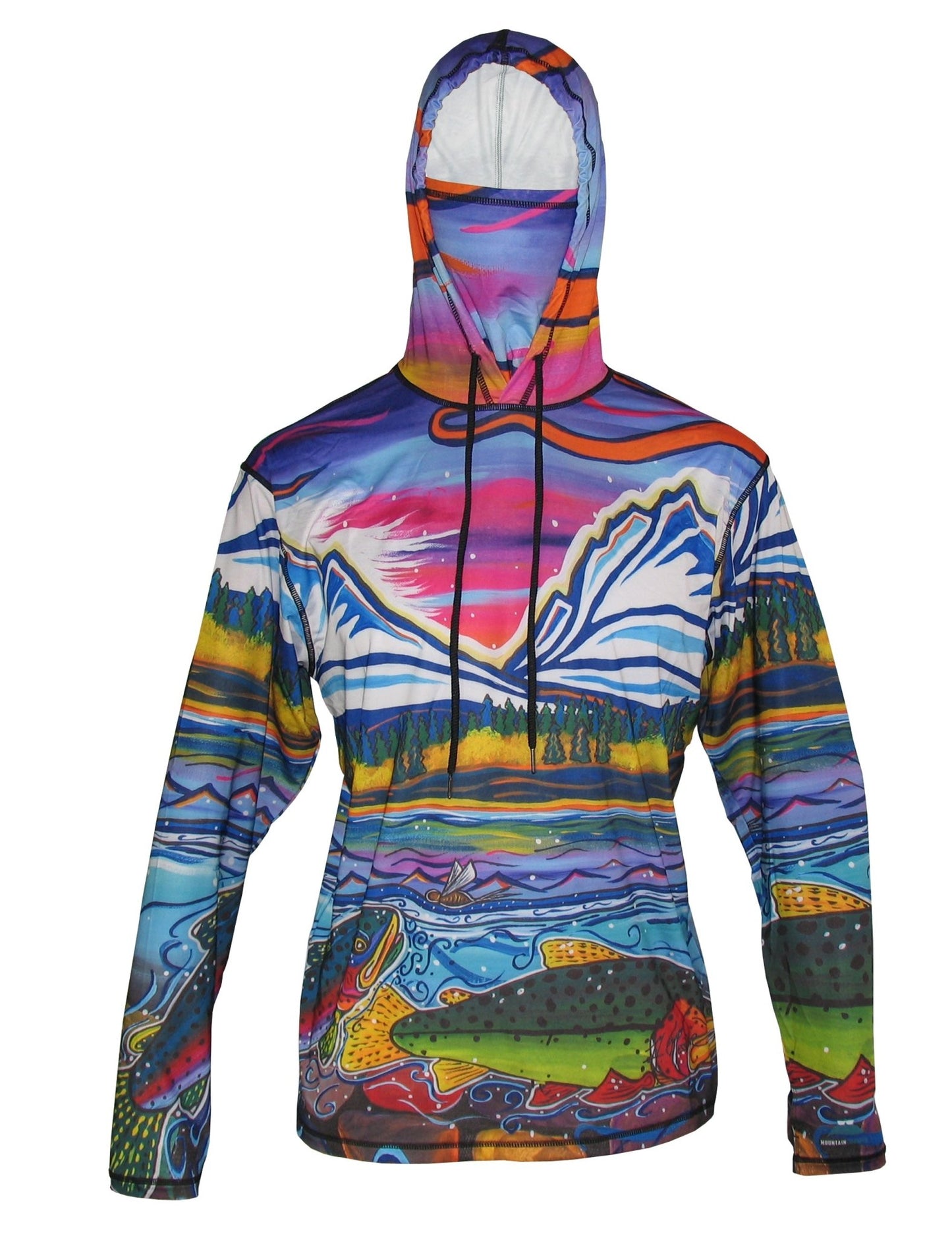 This Mountaincognito lightweight SunPro Hoodie features whimsical wonderful artwork from Heidi Messner. Trout eye mayflies on the surface of this alpine mountain landscape. The sun protective UPF50 Sunpro Hoodie features a lightweight (150gr.) 4-way stretch fabric (85% polyester 15% Spandex) for comfort and fit unmatched. An internal neck gaiter built into the hood is included for free. Great sun protection, moisture wicking apparel.