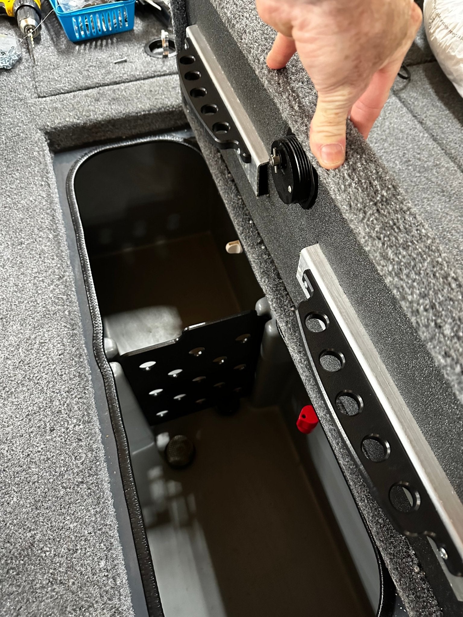 This upgrade kit includes two cull tag holders that attach to the Livewell lid, replacing the divider typically found in the Ranger aluminum 188P and 198P boats. This divider can cause issues for co-anglers during tournaments, as it can be pushed up, allowing fish to swim under it. To alleviate this problem, we have designed the divider to be slightly taller, ensuring it cannot be easily moved when the Livewell is closed.