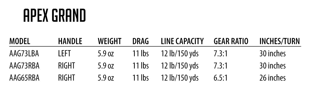 The Apex Grand gives you superior on the water performance. Ardent’s extremely light weight high strength aluminum frame, provides you comfort and strength need for Elite level fishing. 12+1 ball bearing produces top-level smoothness and casting distance. Featuring a deep V6061 T6 machined aluminum spool, an extra long carbon fiber swept back handle with EVA grip knobs. Internally adjustable centrifugal brakes along with externally adjustable 270 degree Mag brake system give you the preformance you need in though conditions. Available in 7.3:1 gear ratio in both right and left hand retrieve, and available in 6.5:1 gear ratio in right hand retrieve.