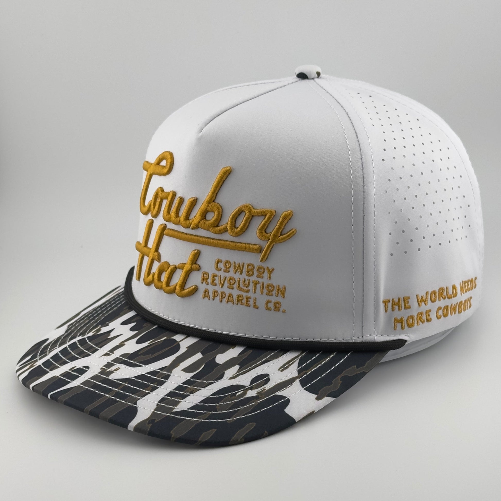 Introducing the Atakapa Flatline - NOLA White “Cowboy Hat” - Performance Patch Rope Hat, a clean fusion of sharp modern style and the unbreakable heartbeat of New Orleans. Built from premium poly/spandex, it moves with you—lightweight, breathable, and tough enough to handle second lines, swamp heat, or whatever the day demands.