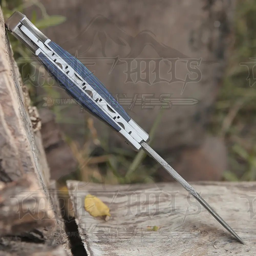 Pakka Wood Handle Damascus Steel Clips File work on the spine |