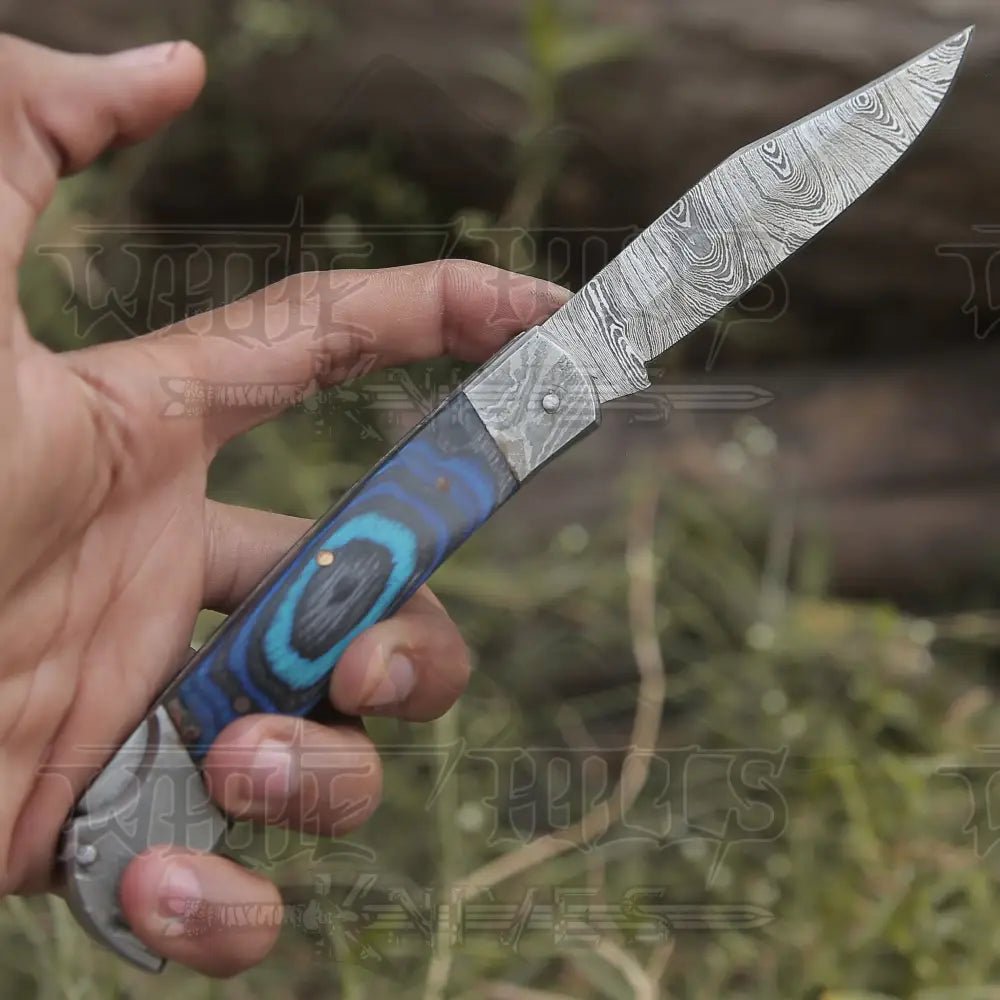 High Grade Hand Forged Folding Knife with Damascus Bolster & Pakka Wood Handle.