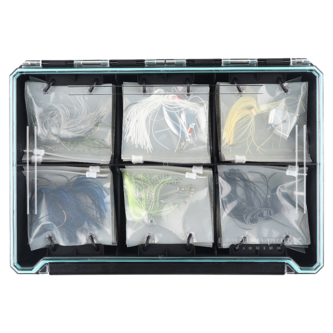Inside, you'll find six sections of baggies, with four stacked per section, allowing for a customizable organization system based on blade combos, colors, or any preference you choose. Unlike traditional tackle storage, this design protects your baits from tangling and damage, keeping them in top condition.