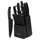 This set includes all the essential knives for your kitchen: 8” Chef Knife, 8” Bread Knife, 8” Slicing Knife, 7” Santoku Knife, 5” Utility Knife, 3.5” Paring Knife, Kitchen Shears, 8” Honing Steel, and (6) 5” Half Serrated Steak Knives. They are all securely displayed in a Hardwood Block.