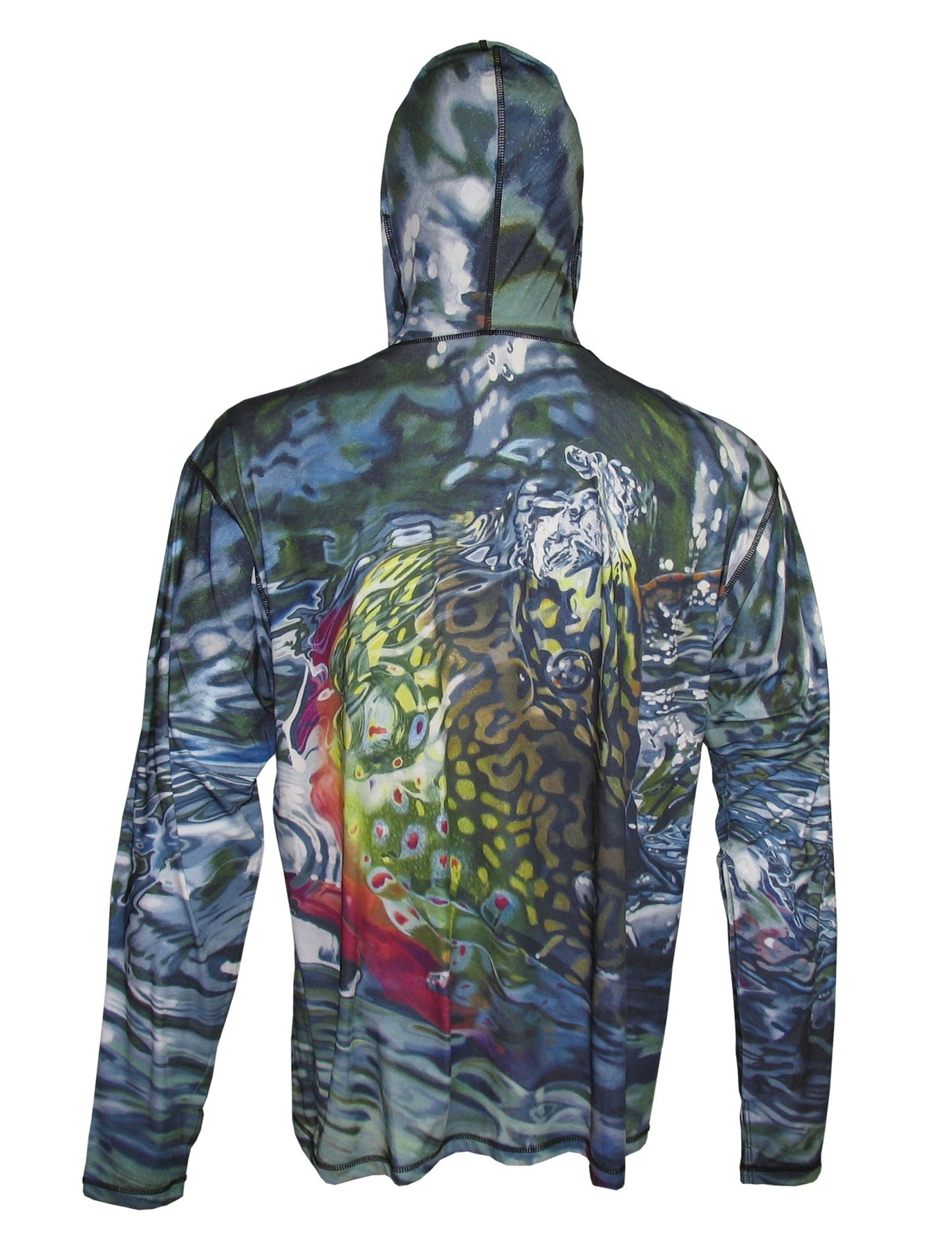 Our newest Travis Sylvester sun protective "SunPro" hoodie features a brook trout rolling in some topwater. Our sun protective fishing hoodies include our patented built-in face masks. Our fly fishing apparel works well as hiking clothes on the trail or in any outdoor activity. Great sun protection, moisture wicking apparel. ORDER NOW FOR AN EXPECTED SHIP DATE: JUNE 1, 2025.