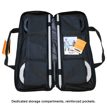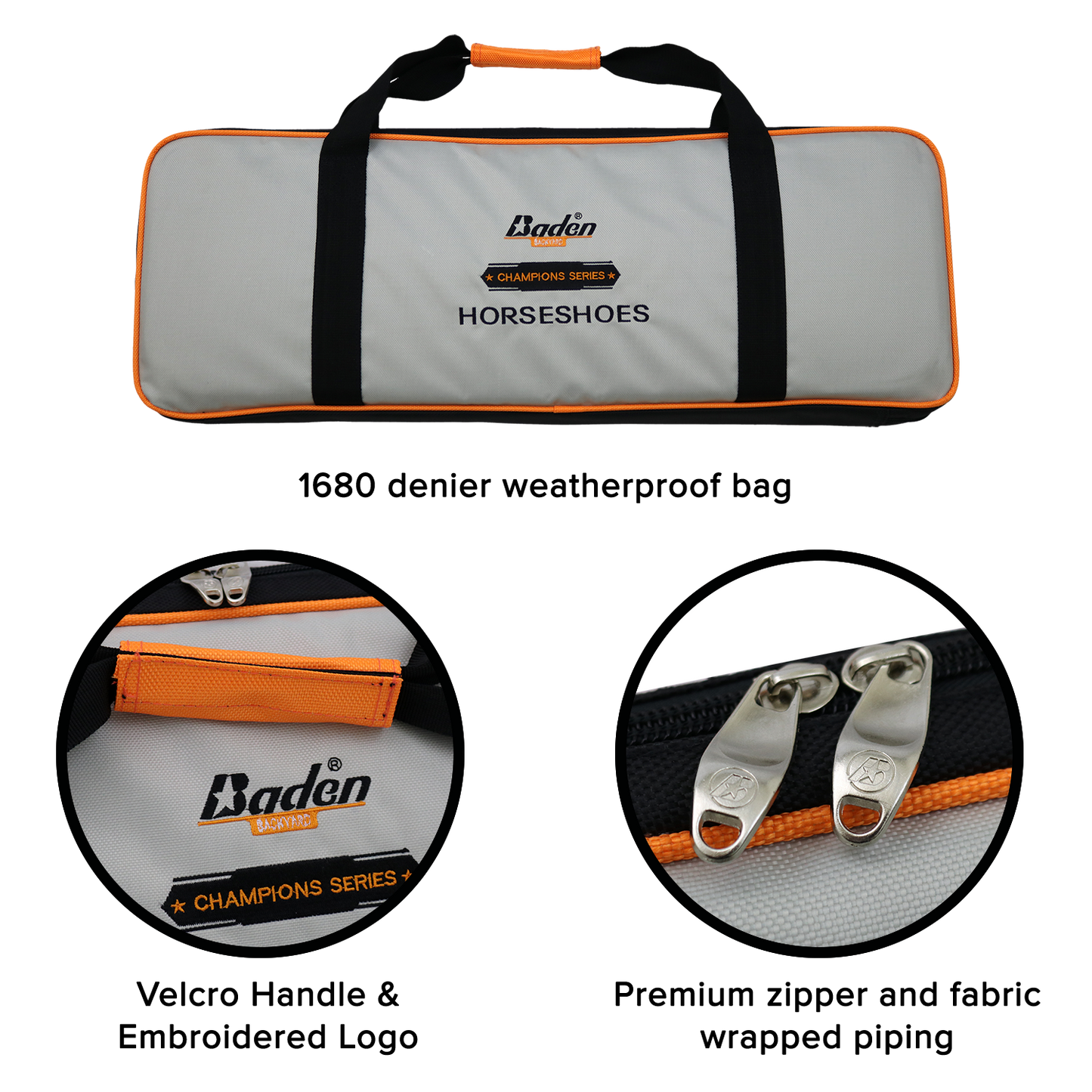 - Set comes in 1680 denier durable nylon bag with reinforced pockets, dedicated storage compartments for horseshoes and stakes, and velcro handle for easy carrying.