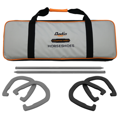 - Conveniently store (2) black forged steel horseshoes, (2) grey forged steel horseshoes and (2) 24” steel stakes in (1) 1680 denier durable nylon bag with reinforced pockets and velcro handle. Rules and instructions are included.