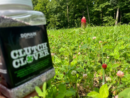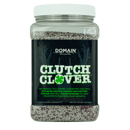 CLUTCH CLOVER IS A UNIQUE COMBINATION OF 3 SPECIAL VARIETIES OF ANNUAL CLOVER DESIGNED TO ESTABLISH QUICKLY AND PROVIDE A QUICK PROTEIN SOURCE TO HANDLE BROWSE PRESSURE WHILE BUILDING UP BIOMASS. DUE TO ITS QUICK, LUSH GROWTH, CLUTCH CLOVER WILL QUICKLY BECOME A FAVORITE LOCATION FOR SPRING, SUMMER, AND EARLY FALL FEEDING DUE TO THE YOUNG TENDER PLANTS THAT PRODUCE TONS OF BIOMASS AND PROTEIN. IN ADDITION TO THE FORAGE PRODUCTION, CLUTCH CLOVER IS AN IDEAL “TILL DOWN” OPTION FOR PLOT ROTATIONS, AS IT FIXATES NITROGEN AND ADDS THAT BACK TO THE SOIL FOR FUTURE FOOD PLOT PLANTING. CLUTCH CLOVER CAN BE PLANTED ON ITS OWN, MIXED WITH LONG-LASTING PERENNIALS AS A DUAL CROP, OR COMBINED WITH BRASSICAS IN THE FALL TO OFFER A GREAT SPRING GREEN UP AND SOIL FIXER. AS AN ANNUAL TILL DOWN MIX, CLUTCH CLOVER OFFERS A VERSATILE FOOD PLOT OPTION PERFECT FOR LOW MAINTENANCE, MINIMUM TILL BACKWOODS PLOTS OR AS A ROTATIONAL CROP IN YOUR LARGE DESTINATION FOOD PLOTS.