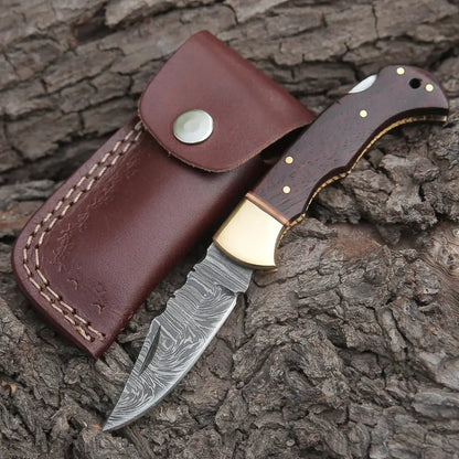 High Grade Hand Forged Folding Knife with Brass Clips Dark Wood Handle.