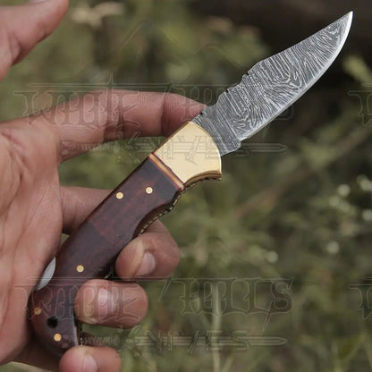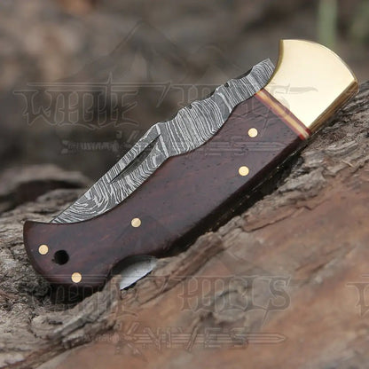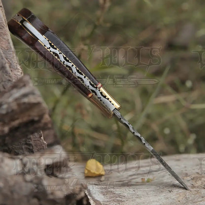 This Beautiful, Hand Forged Folding Knife Features High Grade Damascus Steel Blade & stainless steel frame work. The Dark Wood Is Fixed With Brass Pins To a Brass Inlay. The Spine Of The Blade Has Been Embellished With Exquisite Vine Patterned File-Work.