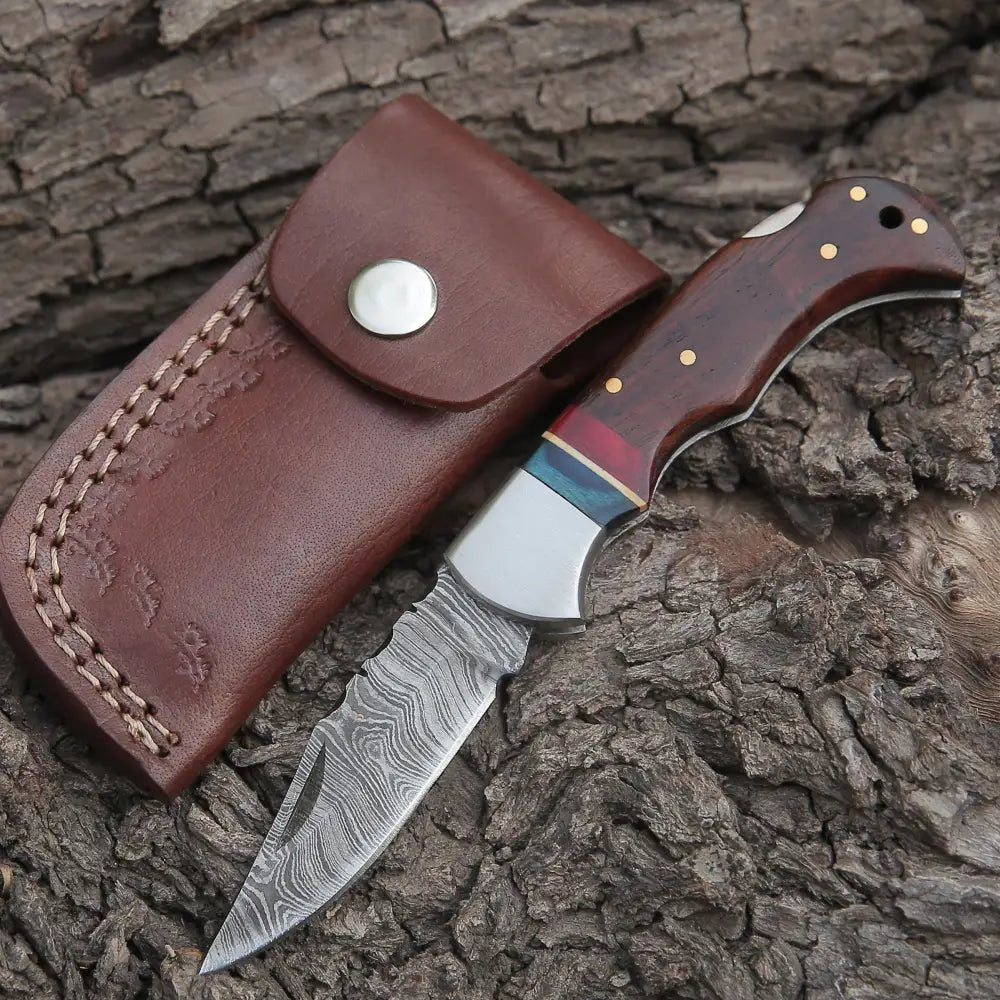 High Grade Hand Forged Folding Knife with Brass Clips Dark Wood Handle.