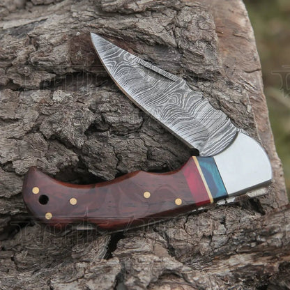 This Beautiful, Hand Forged Folding Knife Features High Grade Damascus Steel Blade & stainless steel frame work. The Dark Wood Is Fixed With Brass Pins To a Brass Inlay. The Spine Of The Blade Has Been Embellished With Exquisite Vine Patterned File-Work.