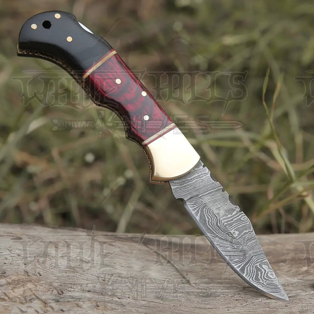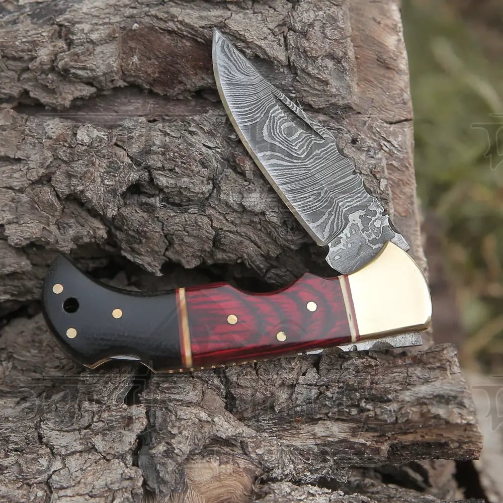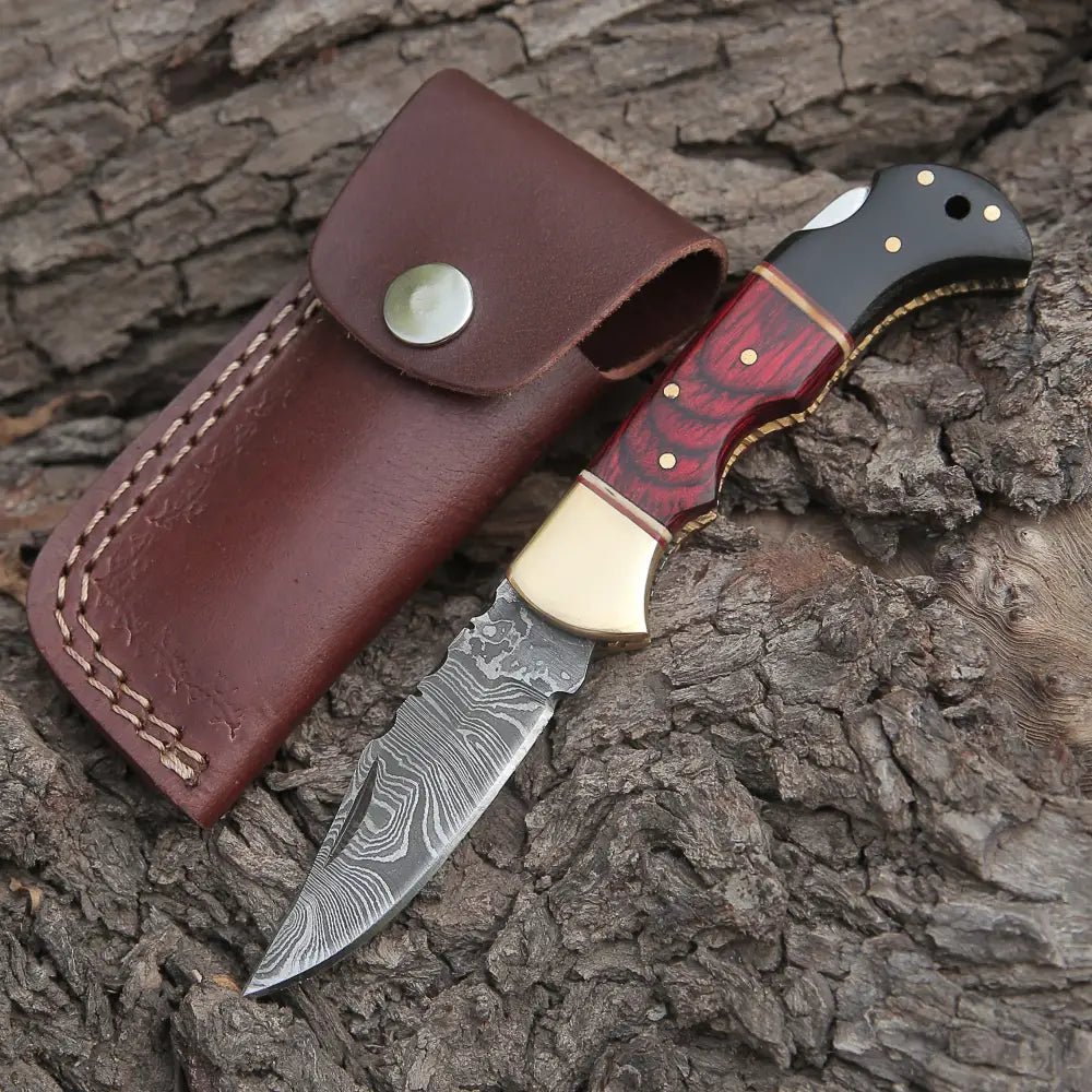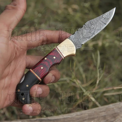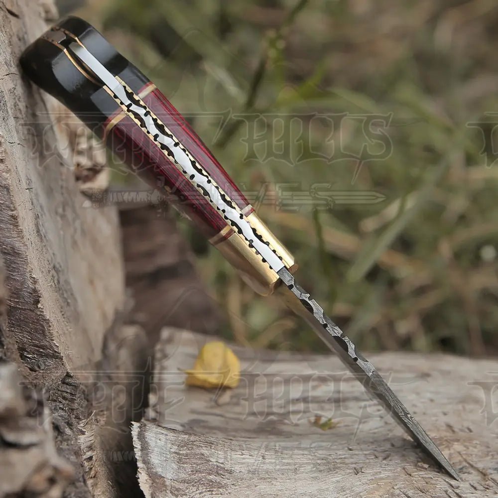 This Beautiful, Hand Forged Folding Knife Features High Grade Damascus Steel Blade & stainless steel frame work. The Red Dollar sheet & Black Horn Is Fixed With Brass Pins To a Brass Inlay. The Spine Of The Blade Has Been Embellished With Exquisite Vine Patterned File-Work.