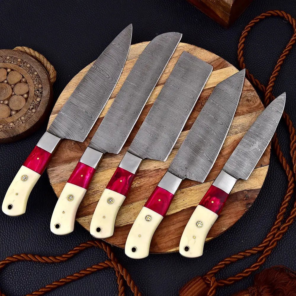 CUSTOM HAND FORGED DAMASCUS STEEL CHEF SET WITH BONE & STAINED WOOD HANDLE