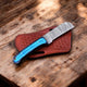 Experience precision cutting with our custom handmade Bull Cutter Knife. Crafted from Damascus steel, this knife offers exceptional durability and a razor-sharp edge. The exotic blue handle provides a comfortable grip, ensuring optimal control for every cut. With an overall length of 8.5 inches, it's designed for versatility and efficiency. Includes a premium leather sheath for safe storage and easy carrying.