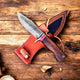 Crafted for the outdoors, this custom handmade hunting knife features a razor-sharp Damascus steel blade, ensuring durability and precision. With an overall length of 9 inches and a 4.5-inch rosewood handle, this knife provides a comfortable grip and superior control. The Damascus guard enhances both aesthetics and functionality. It comes with a premium leather sheath for safe storage and easy carry—perfect for hunters and collectors alike.