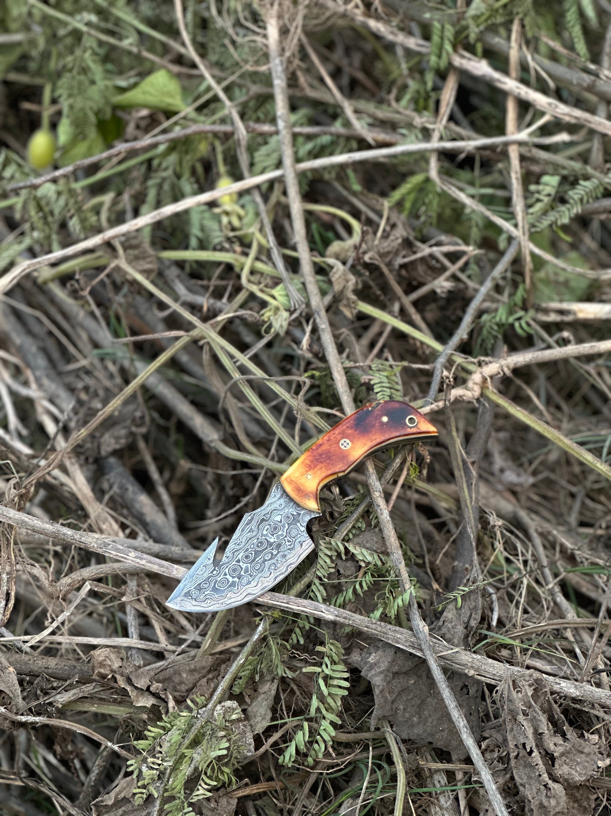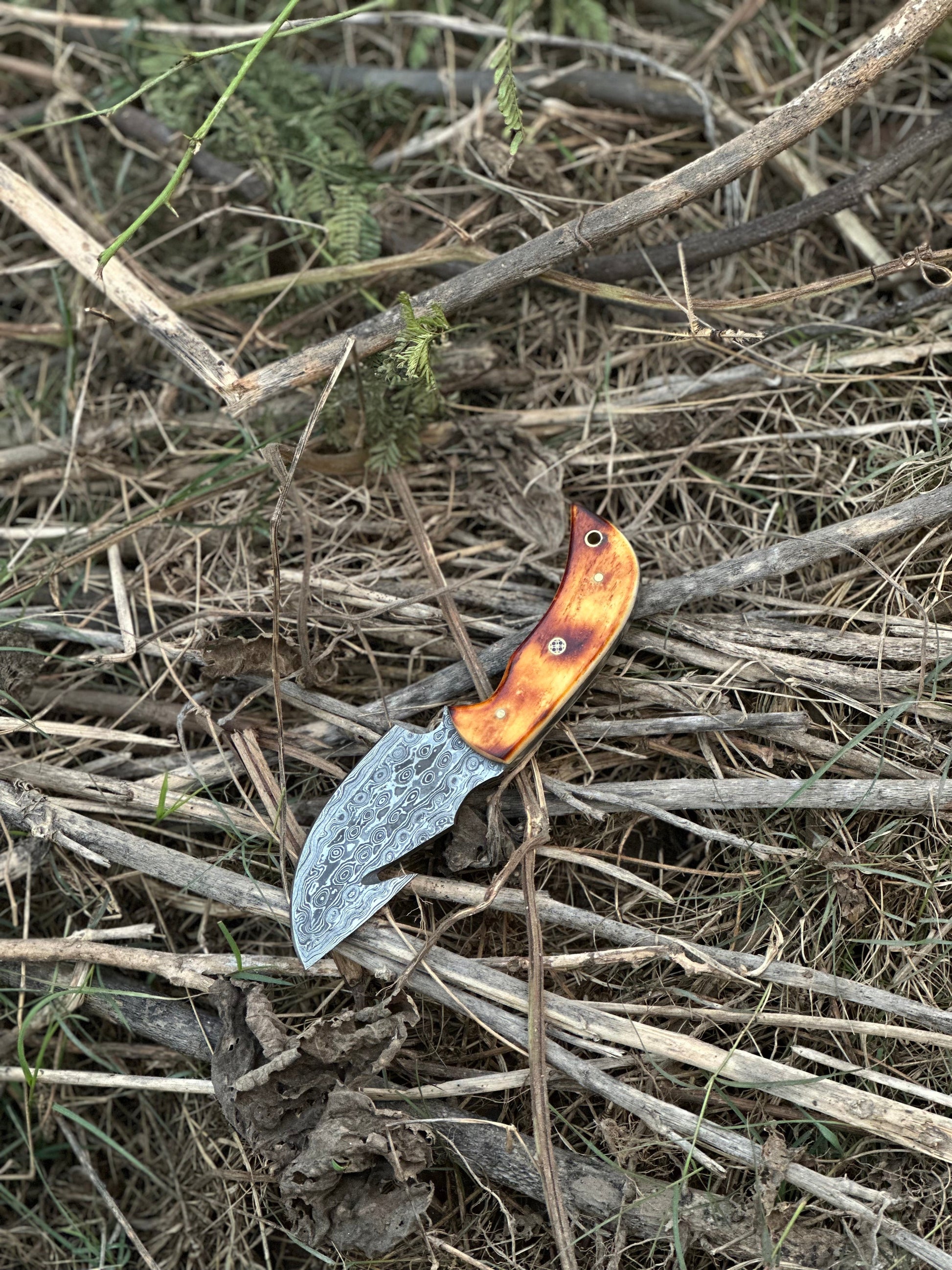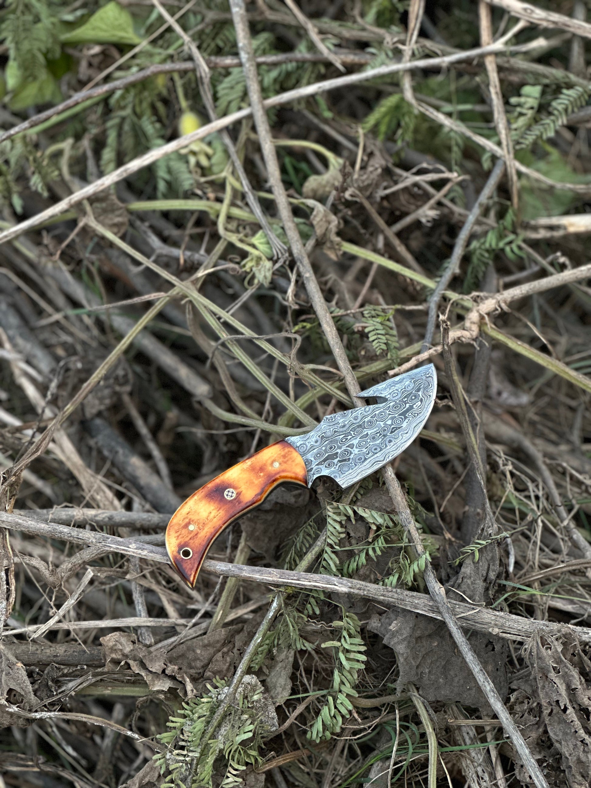 Elevate your outdoor gear with our custom handmade Damascus steel guthook skinning knife, featuring a classic camel bone handle. This 7.5” knife is expertly crafted to deliver precision and durability, making it an indispensable tool for skinning and other outdoor tasks. The Damascus steel blade is renowned for its sharpness and intricate patterns, while the camel bone handle offers a sturdy and comfortable grip. Paired with a handcrafted leather sheath, this knife is both functional and a perfect gift item for those who value quality craftsmanship.