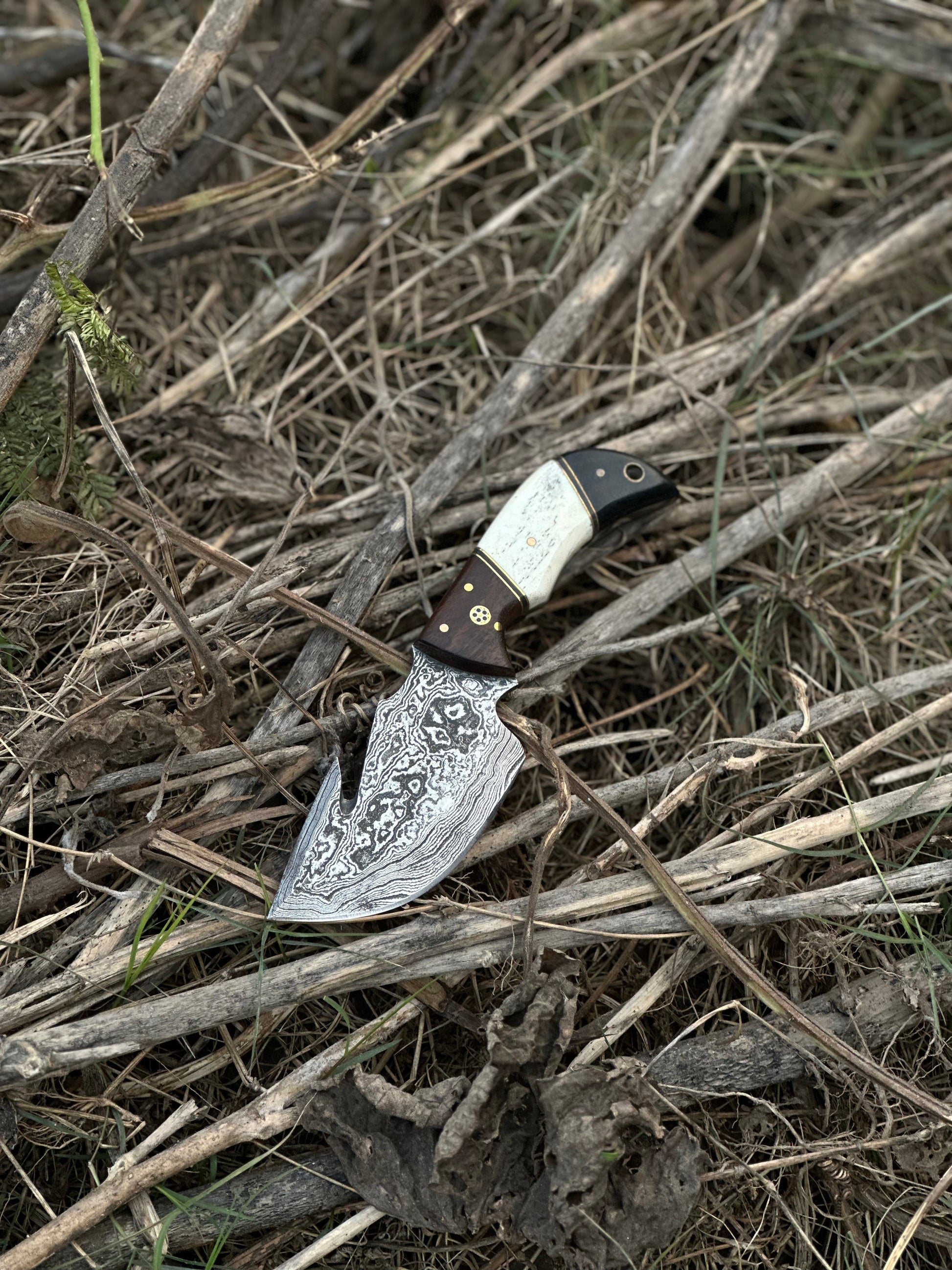 Elevate your outdoor gear with our custom handmade Damascus steel guthook skinning knife, featuring a unique handle crafted from rosewood, camel bone, and black sheet. Measuring 7.5 inches in overall length, this knife is designed for precision and durability, making it an essential tool for hunters and outdoor enthusiasts. The Damascus steel blade ensures exceptional sharpness and strength, while the combination of materials in the handle offers both style and comfort. Complete with a custom leather sheath, this knife is not only practical but also a perfect gift item for those who appreciate fine craftsmanship.