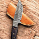 Experience precision cutting with this custom handmade skinning knife crafted from high-quality Damascus steel. The razor-sharp blade ensures excellent edge retention, making it perfect for hunting and field dressing. Its ergonomic buffalo horn handle with a Damascus bolster provides a secure and comfortable grip. Includes a premium leather sheath for safe storage and easy carry.