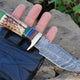 Crafted for hunters and outdoor enthusiasts, this custom handmade hunting knife features a 3.75-inch Damascus steel blade known for its strength and sharpness. The 7.5-inch overall length ensures a balanced grip, while the antler horn and exotic wood handle with a brass guard adds durability and a classic look. Complete with a leather sheath for safe storage, this knife is a perfect companion for your next adventure.