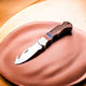 Experience precision and durability with this custom handmade pocket knife featuring a 3-inch stainless steel blade and an exotic wood and rosewood handle for a secure grip. Designed with a back lock mechanism for safety and ease of use, this premium-quality knife comes with a leather case for protection and portability. Perfect for everyday carry, outdoor adventures, or as a collectible piece.