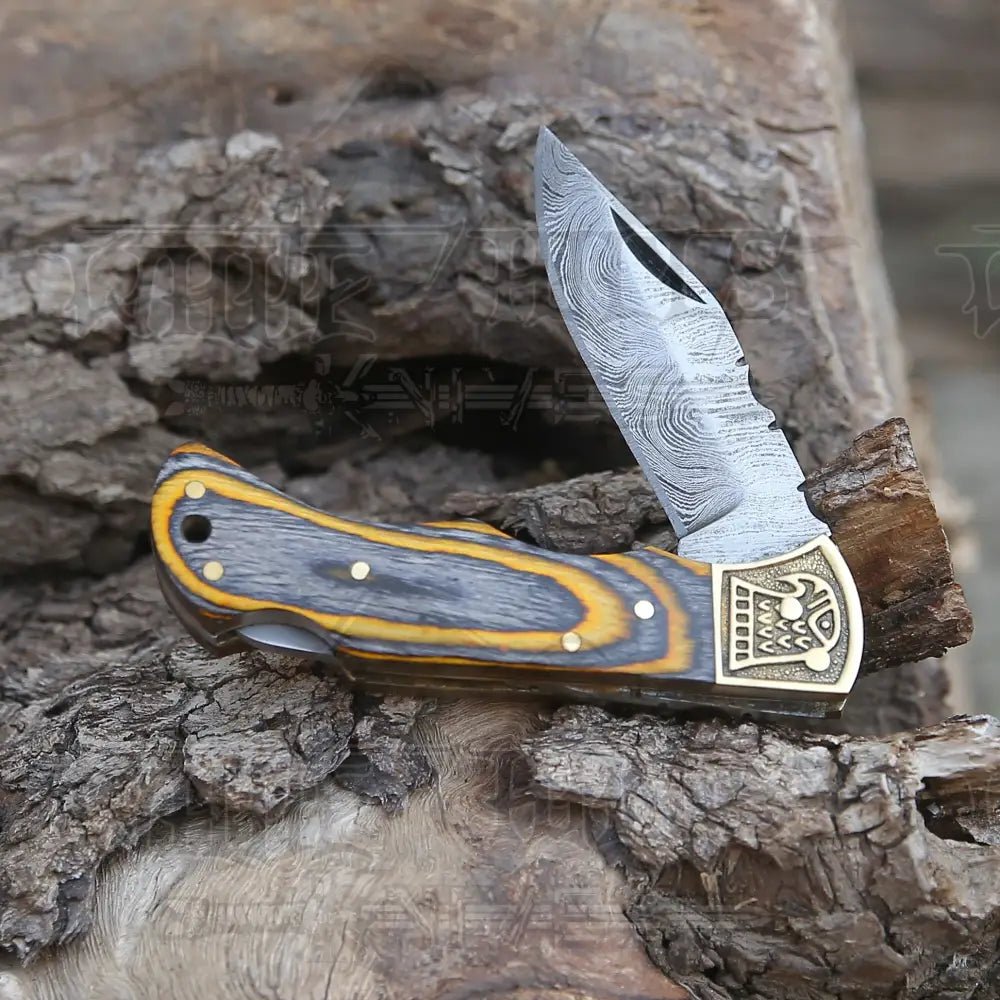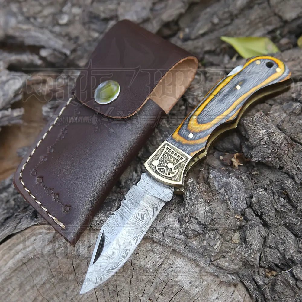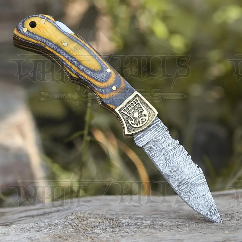Customs Hand Made Damascus Steel Hunting Folding Knife Brass bolster with colored Wood Handle