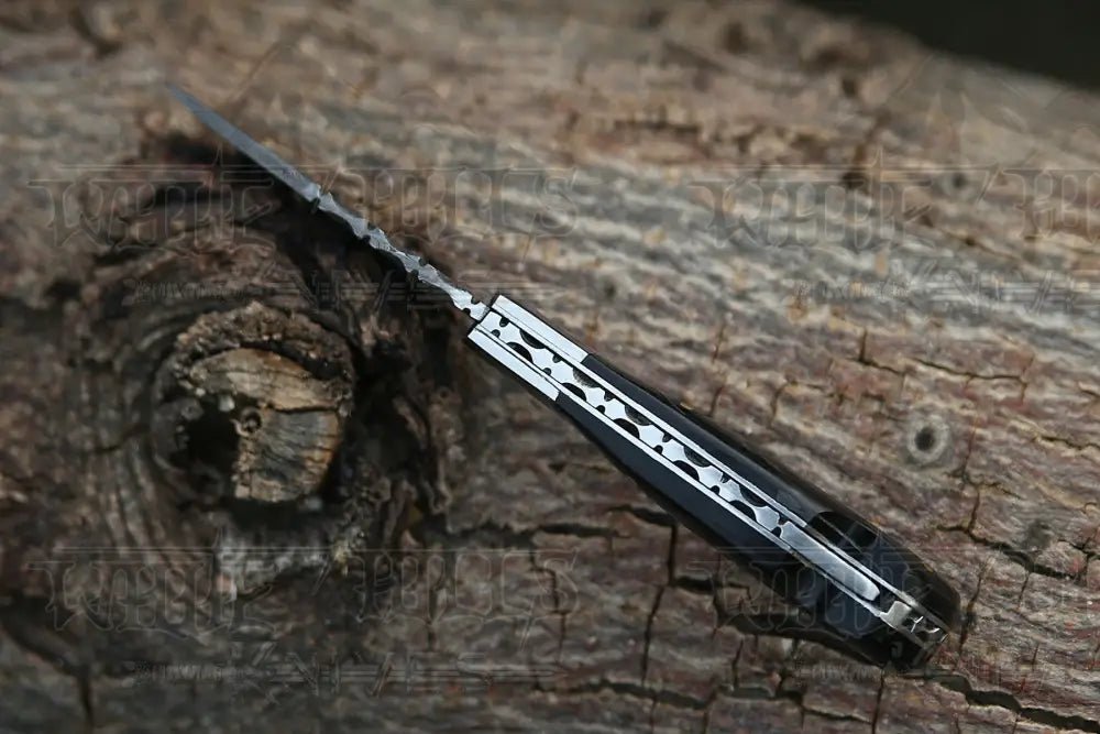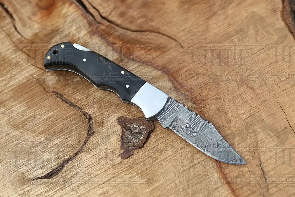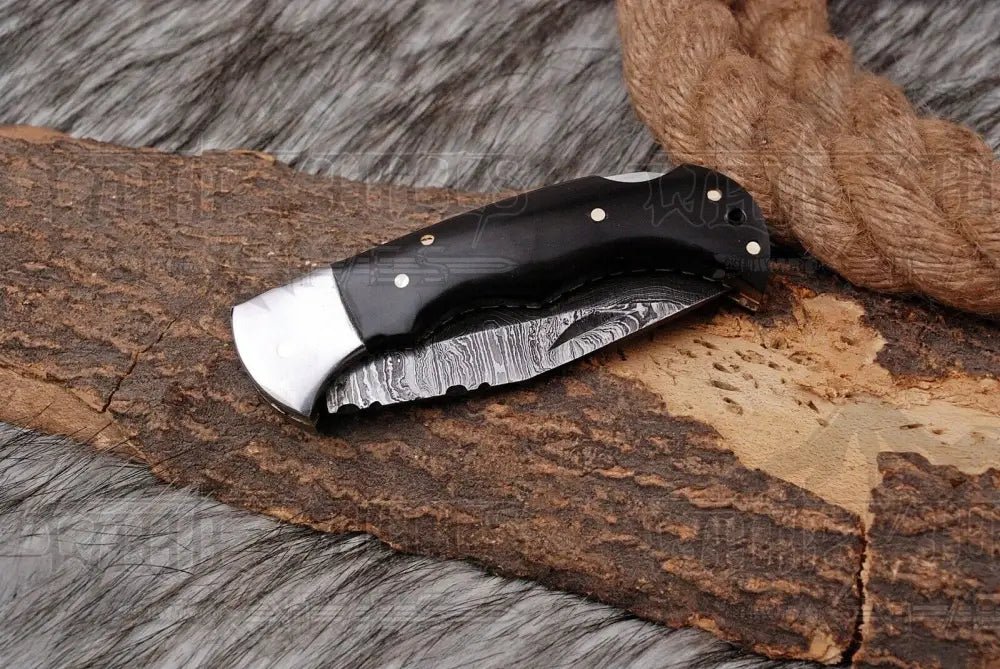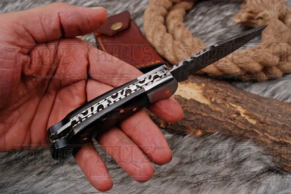 Customs Hand Made Forged Damascus Steel Folding Knife Steel Bolster Bull Horn Handle